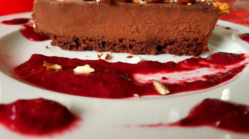 2 jaja zmiksati, dodati 100 g rastopljene tamne čokolade ( 74 % ), 150g rastopljenog maslaca, 2 žlice kokosovog brašna 12g (može i bademovo), orašaste plodove (orah 15g, lješnjak 15g) zblendati s pola praška za pecivo. Ostale sastojke sjediniti s jajima. Peći na 180c 20 minuta.