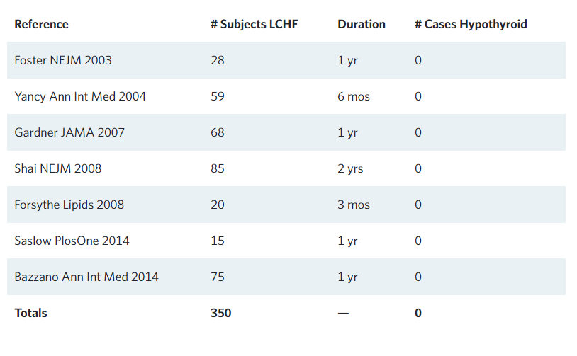 Iako ove studije nisu bile namjerno dizajnirane za traženje disfunkcije štitnjače, teško je propustiti hipotireozu. Ove studije su vodili (ili pratili) vrhunski liječnici, pa bi novi slučaj hipotireoze svakako bio prijavljen kao “ozbiljan štetni događaj” povezan s LCHF prehranom. Pa ipak, u 350 pobliže praćenih pacijenata, nije bilo ničega!