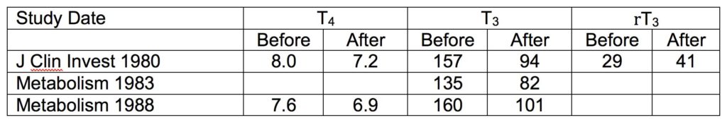 Zato pogledajmo ove podatke s tri perspektive: 1.) neuspjeh štitnjače da napravi dovoljno T4, 2.) neuspjeh jetre da pretvori dovoljno T4 u T3 i 3.) značajno poboljšava T3 osjetljivost. Počevši s najnovijim podacima iz Yancy et al. Prvo, ako ili štitnjača ili jetra ne uspijevaju zadržati adekvatan učinak hormona štitnjače, TSH bi se trebao povećati. Ali se ne povećava, i to je mjereno samo u jednoj studiji. Drugo, ako jetra ne uspijevaju proizvesti dovoljno T3, tada bi vrijednosti TSH i T4 trebale porasti. U oba naših izvještaja 1980. i 1988., T4 se blago smanjio. I treće, u sva tri ispitivanja razina T3 u krvi se naglo smanjila (od prosjeka od 151 do 92), ali klinički znakovi i simptomi nisu bili indikativni za preveliki hipotireoidizam.