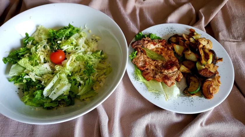 Meso napacati jedan dan ili bar 2-3 sata sa senfom, češnjakom, luk, sol, kopar, ružmarin, papar i lovor. Ispeči meso na masti. Povrće narezati i propržiti u woku sa malo začina kopar, sol, češnjak i papar (začini po želji). Zelenu i zelje salatu začiniti sa maslinovim uljem, soli jabučni octom ili sokom od limuna.