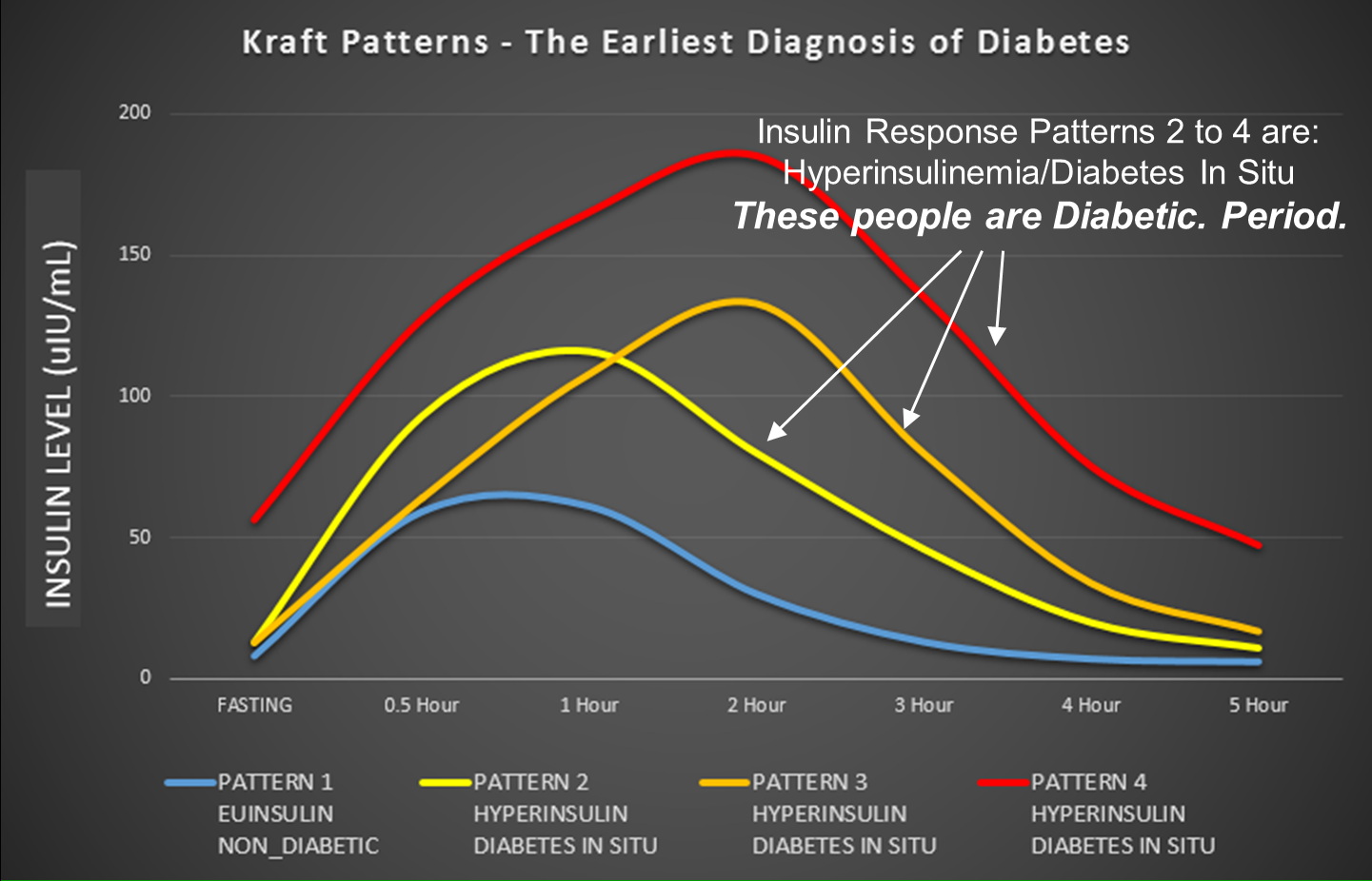 Prije nekoliko godina Dr. Kraft je razvio test inzulina umjesto glukoze. Taj test je sličan testu tolerancije na glukozu s tom razlikom što se umjesto razine glukoze u krvi, prati razina inzulina. Graf u nastavku pokazuje različite profile odgovora u različitim stadijima dijabetesa. Najniža plava linija prikazuje normalan profil. Ostale 3 predstavljaju različite stadije dijabetesa.