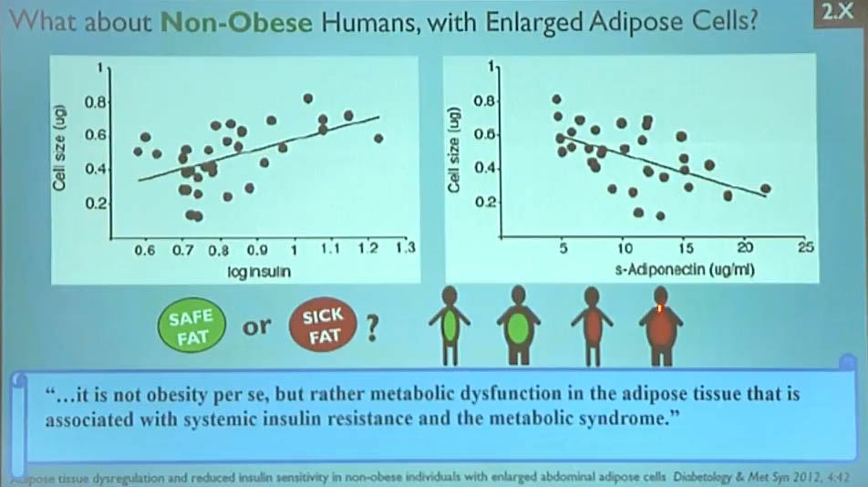 Ključ je, dakle, u smanjenju veličine masnih stanica. Neki ljudi s puno masnih stanica, ali malih, nemaju problema s inzulinom. Sa druge strane, neki ljudi s malo tjelesne masti, ali s velikim masnim stanicama, imaju problema s inzulinom i dijabetes. Zbog toga ljudi s 50 kg također mogu dobiti dijabetes bez dobivanja na težini. Masne stanice, kada se povećaju, više na dopuštaju skladištenje dodatne masti u njih jer se upale. Upravo to stanje preokreće metabolički slom.