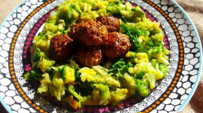 Kelj (300g) kratko prokuhati sa malo soli i procijediti. Na maslinovom ulju kratko blanširati sa malo češnjaka i papar. Mesne okruglice su začinjene: paprom, himalajkom soli, češnjakom, crvenom paprikom, curry i žličicom senfa. Oblikovati kuglice i lagano peći na masti.