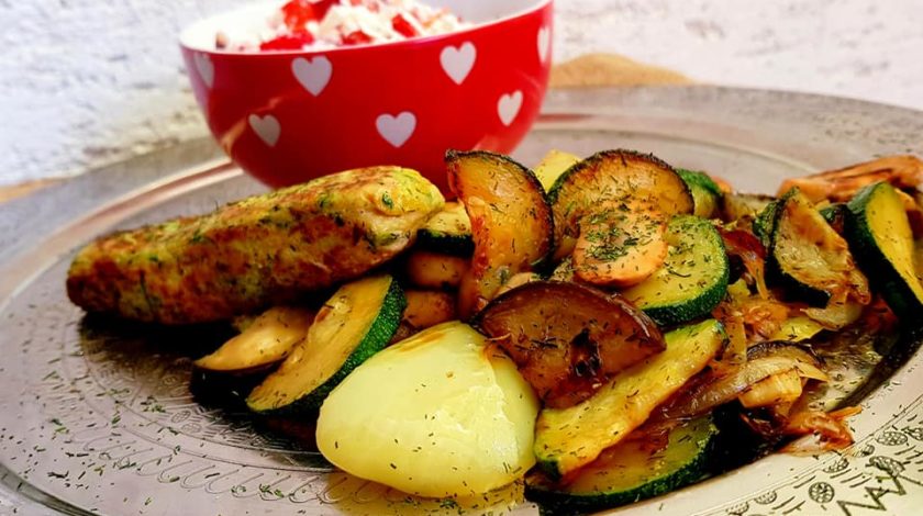 Naribati pola tikvice oko 50-60 grama te ju dobro procijediti. Pureće meso začiniti s lukom i začinima te dodati naribanu tikvicu. Na prozirnoj foliji oblikovati roladu. Zamotati i ostaviti malo u frižideru da se stisne. Narezano povrće na kockice: ostatak tikvice, patlidžan, gljive i papriku speći u woku ili tavi te dodati začine. Roladu speći na masti na gril ili nekoj drugoj tavi.
