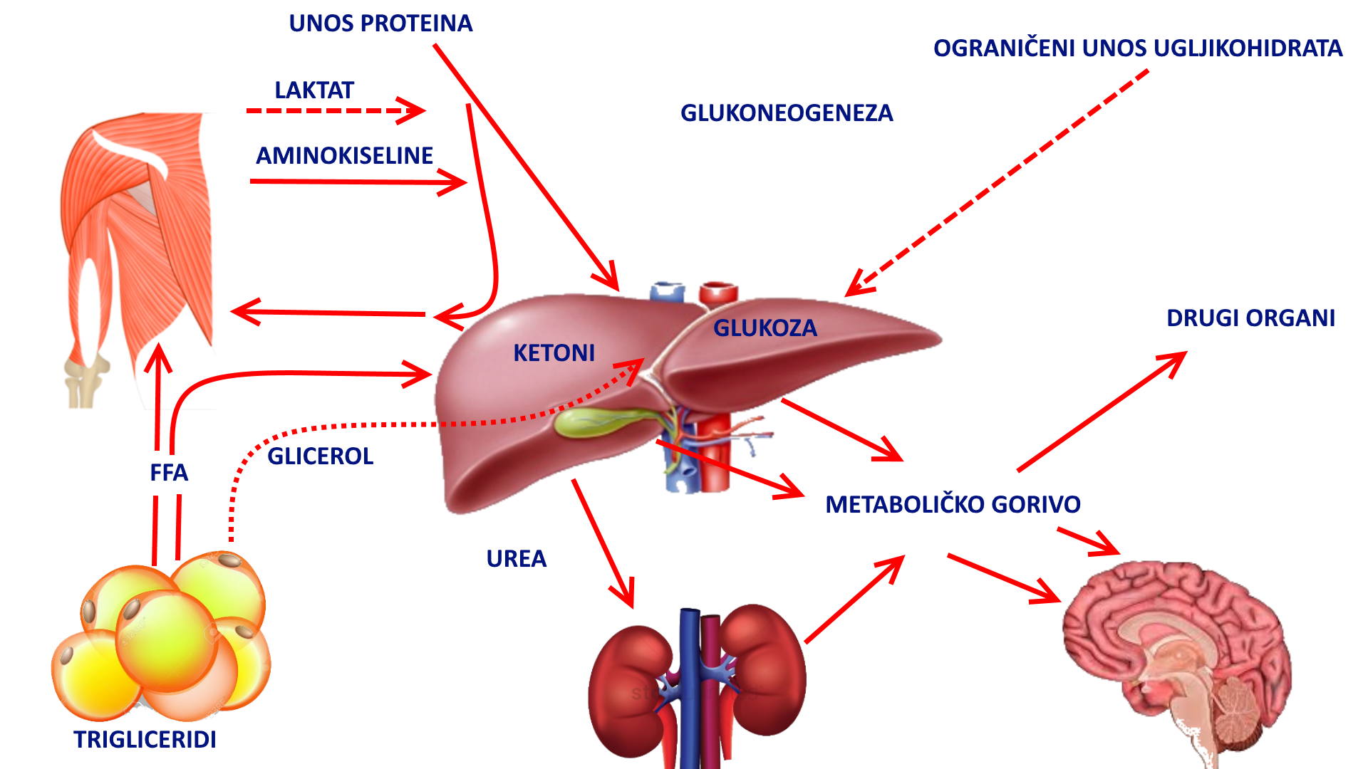CILJ KETOZE “prisiliti” tijelo da umjesto ugljikohidrata koristi masti kao izvor energije. Da biste koristili mast kao izvor energije, vaše tijelo pokreće metabolički proces zvan ketoza. Ovaj proces omogućuje vašim stanicama da koriste masti kao primarni izvor energije, pretvaranjem prehrambenih masti u ketone. Ketoni su tvari (kiseline) koje se proizvode u jetri, a kasnije se koriste za gorivo.