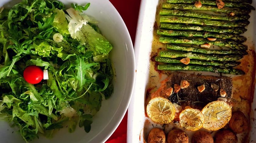 Marinirati lososa bar 30 min s maslinovim ulju, soli, ružmarin, kopru, peršinu ,češnjaku te poredati tanke kriške limuna. Šparoge oprati i odrezati deblje krajeve. Poslagati u pleh te ih posolite i pouljite te ih stavite peći zajedno sa ribom i šampinjonima (20-30 minuta na 200 stupnjeva). Podliti još malo s maslinovim. Zelenu salatu i rukolu začiniti s maslinovim i sokom od limuna.